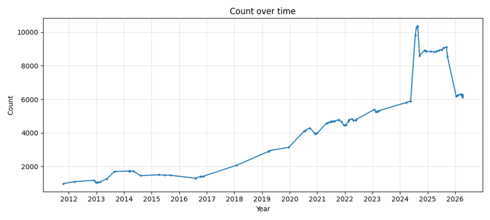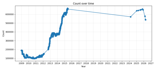 CfDs over time – this chart was made possible by generative AI and uses data of scraped from Wayback Machine archives of Category:Categories for discussion via a new tool