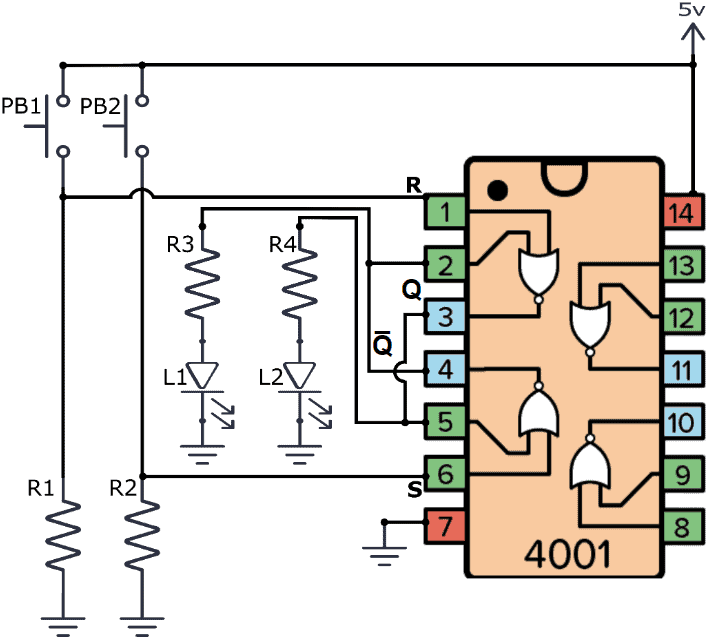 As a practical example, you can build an SR latch using the CD4001 chip. Below you can see how the CD4001 has four NOR gates inside, making it ideal for this kind of application.