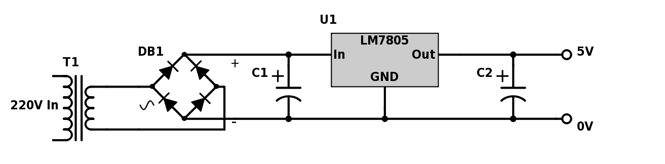 I want to base the power supply circuit around the LM7805 voltage regulator because it’s an easy-to-find chip that is simple to use. This component will give a stable output voltage of 5V up to 1.5 A.