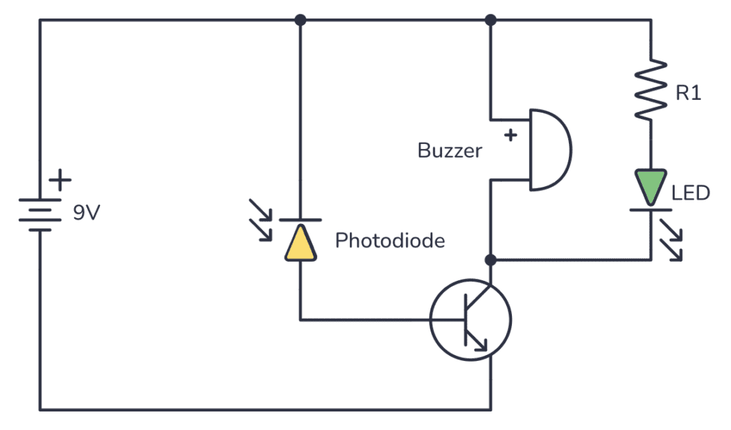 You can build your first photodiode circuit using just a few components on a breadboard. This circuit will sense fire and raise an alarm. The component list is: