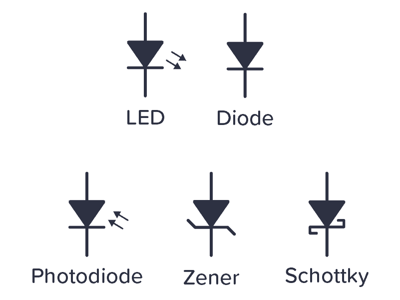 The diode family has several different symbols because there are several different types of diodes. Below is a standard diode, a Zener diode, a Schottky diode, and a Light-Emitting Diode (LED).