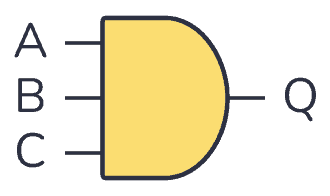 An AND gate is a logic gate where the output goes HIGH (or “1”) only if all its inputs are HIGH. So if the inputs A AND B are HIGH, the output Q will also be HIGH.
