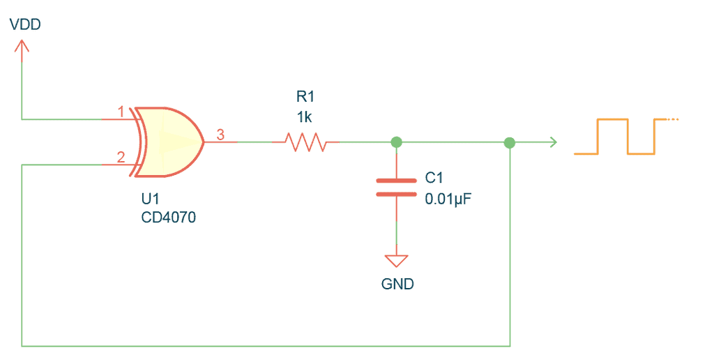 Here’s an example circuit based on the XOR gate in the 4070 IC. It uses a capacitor of 0.01µF and a resistor of 1 kΩ which should give out a frequency of about 2 MHz.