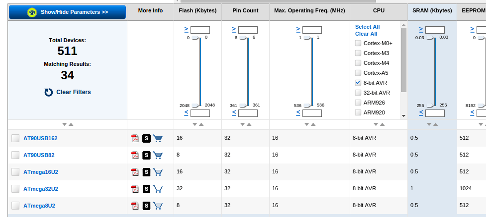 Since all of these seem to fit our requirements, it doesn’t matter which one we choose. So let’s choose the one that has the most amount of flash. More flash means that we can store bigger programs on the chip.
