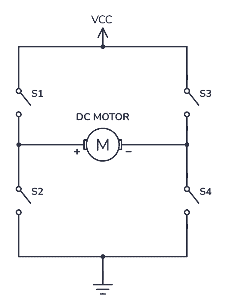 Here’s the concept of the H-bridge drawn out with switches: