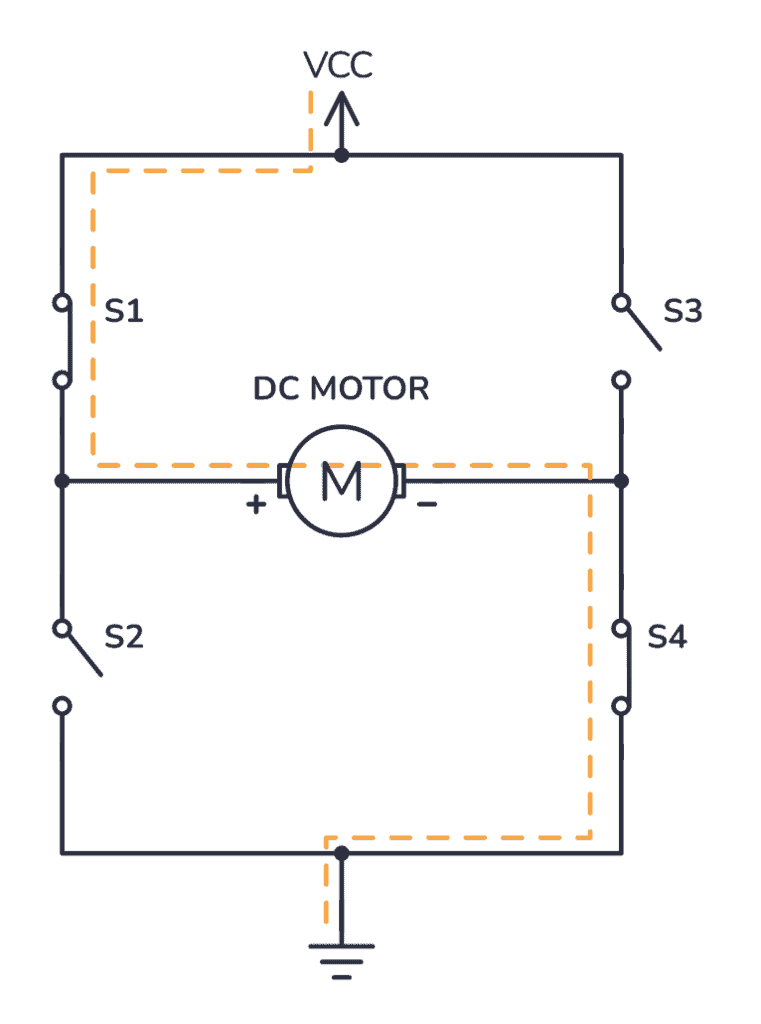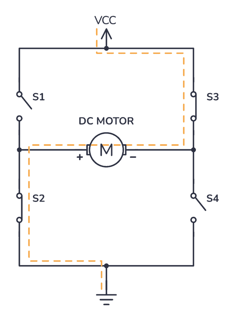 If you instead close switches 2 and 3, you have plus connected to the right side and minus to the left side. And the motor spins in the opposite direction.