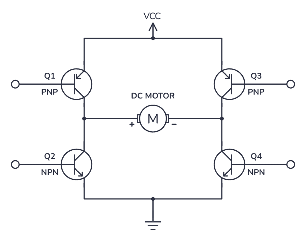 That won’t work if you have NPNs at the top since the emitter will be 0.7V lower than the base. Because that turns into 3.3V – 0.7V = 2.6V at the positive side of the motor, no matter what VCC voltage you choose.