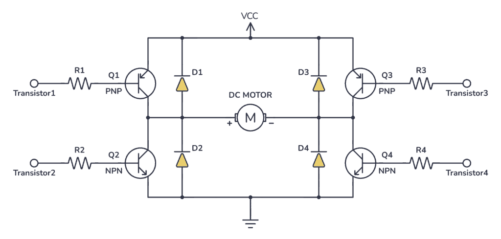 Since the transistor can be a switch, you’ll be able to make the motor spin in either direction by turning on and off the four transistors in the circuit above.