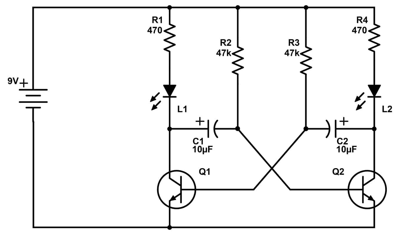 The astable multivibrator circuit is a classic circuit for flashing two LEDs. It doesn’t have to flash two LEDs though. It can blink just one LED. Or it can create a tone to play on a speaker.