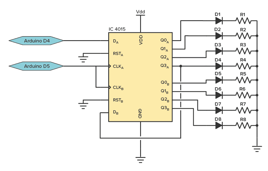 Here’s a practical example that shows you how to use the CD4015 to add 8 additional outputs to an Arduino by using only two Arduino pins: