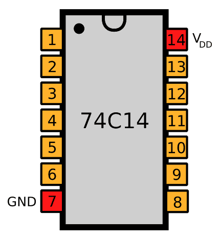 The numbers next to each pin in the diagram represent the pin number on the integrated circuit. Click here for the pinout of the Hex Schmitt Trigger Inverter IC.