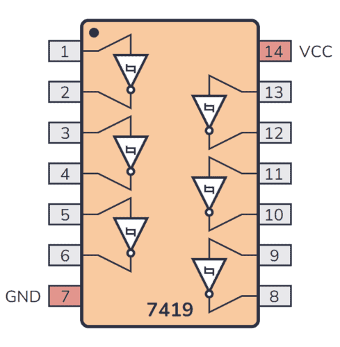 The 74LS19 has 14 pins and contains six inverters laid out as shown in the pinout diagram below: