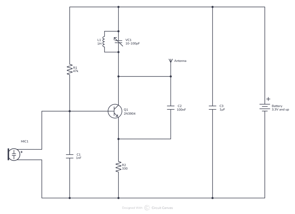 The transistor then amplifies this audio signal, making it strong enough to drive the rest of the circuit. The heart of the transmitter is the LC tank circuit, comprising the inductor (L1) and the variable capacitor (VC1). This LC circuit generates signals at a specific frequency by continuously charging and discharging, a bit like swinging back and forth on a playground swing. This signal is then sent to the antenna, ready to be broadcasted.