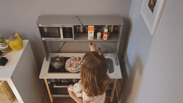 Finally, I connected the LED strip connector to the LED strip, then taped the LED strip to the roof of the toy kitchen. Most LED strips already have double-sided tape underneath, so did mine, so I only had to remove the protective tape then stick it.