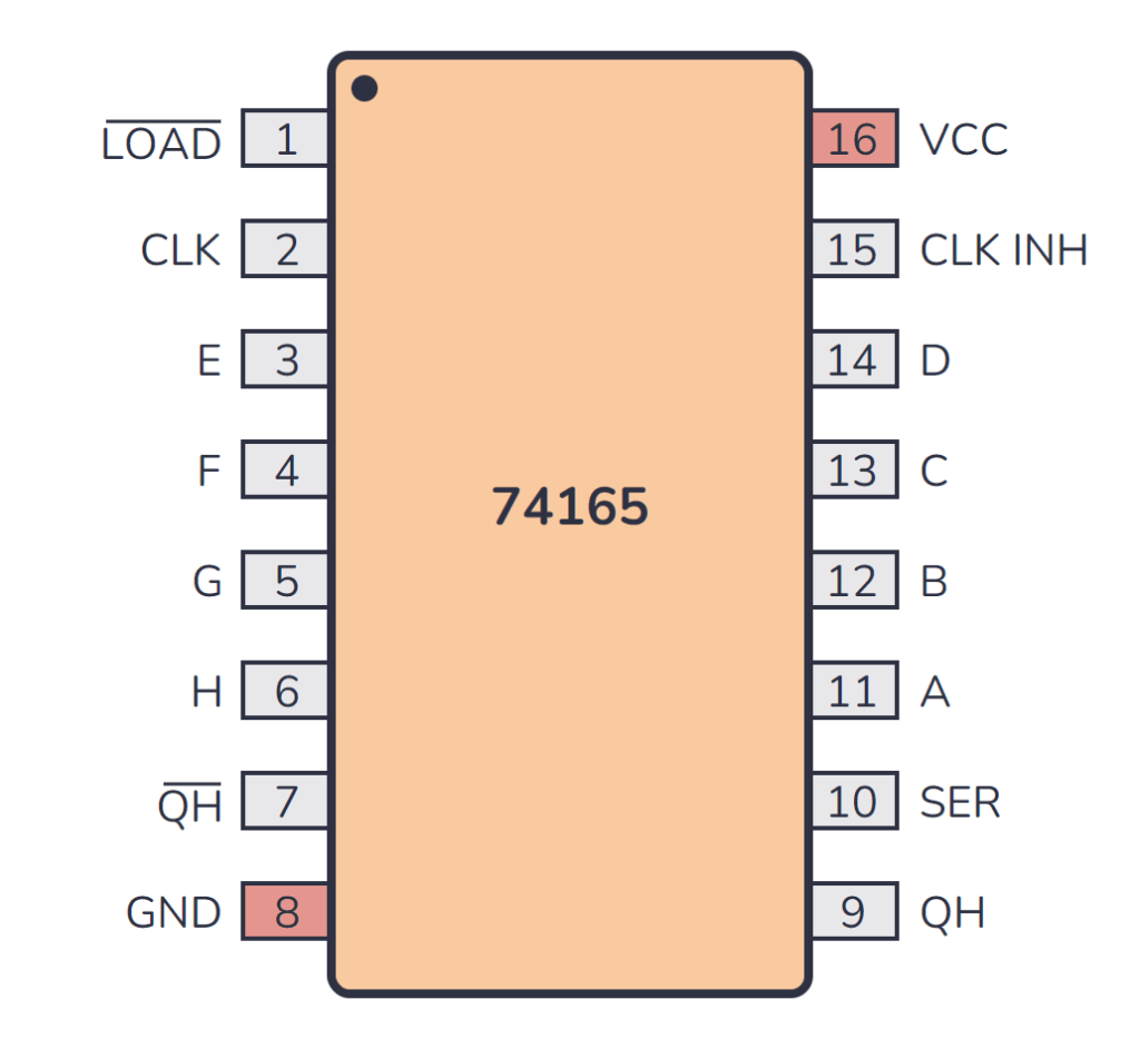 The 74×165 has 16 pins and contains 8-bit parallel-in, serial-out shift register laid out as shown in the pinout diagram below: