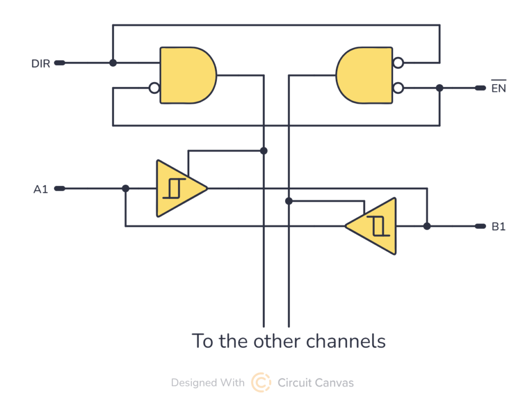 You control the direction of data flow with the direction (DIR) input. When you set DIR to HIGH, data moves from bus A to bus B. And when you set DIR to LOW, data travels from bus B to bus A.