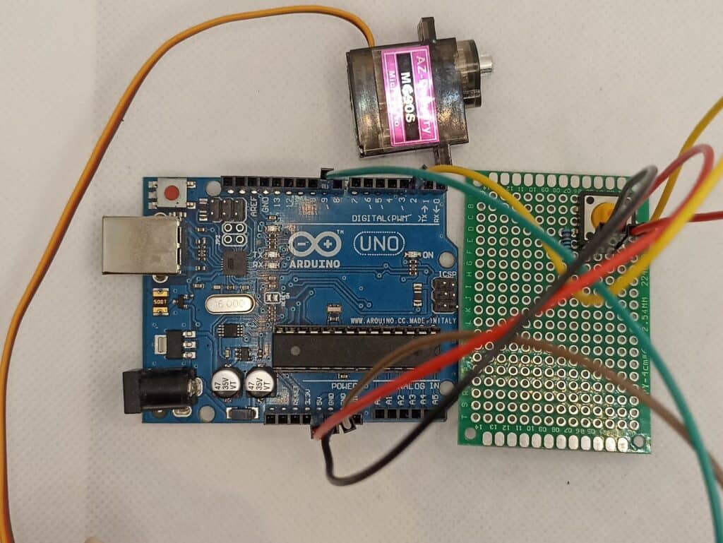 We’ll start by soldering the button, the resistor, and the pin header on a perfboard. Then we’ll connect the servo and power supply. And finally, we’ll upload the code.