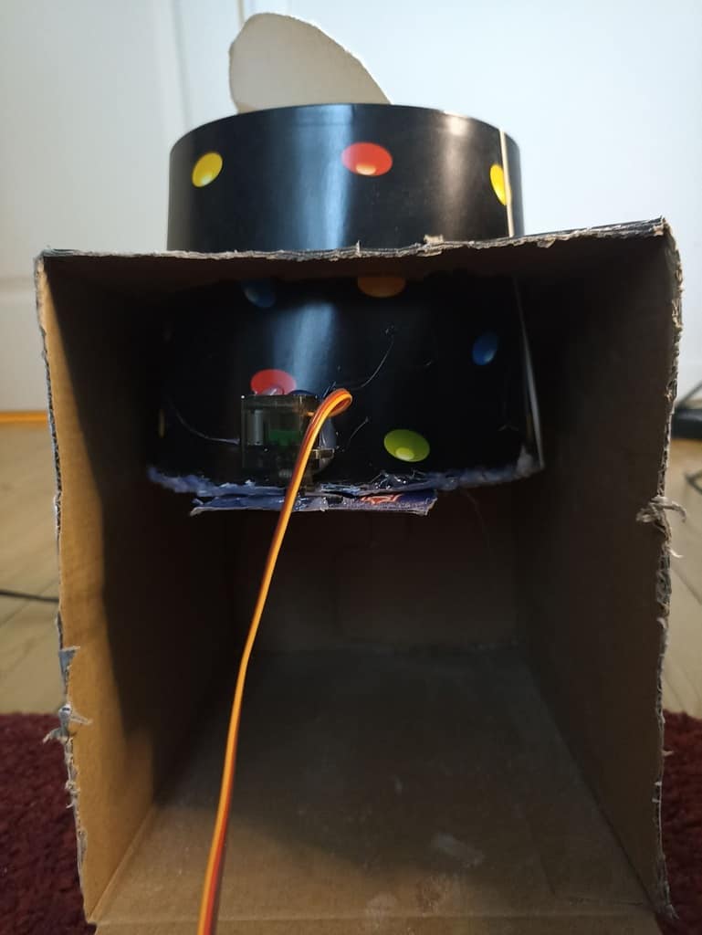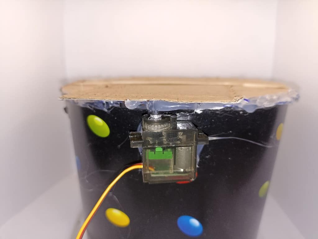 The servo motor opens or closes the sugar dispenser using a little piece of cardboard that moves over a hole.