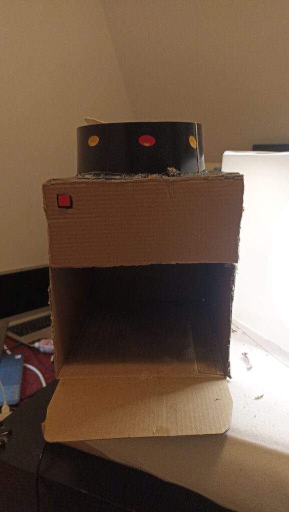 You could have a functional dispenser right here, but I wanted to make it more professional looking for my kitchen, so I took the extra rectangular cardboard, make a square hole size for the button on it, and on the other side of that cardboard place your Arduino and PCB with the button.