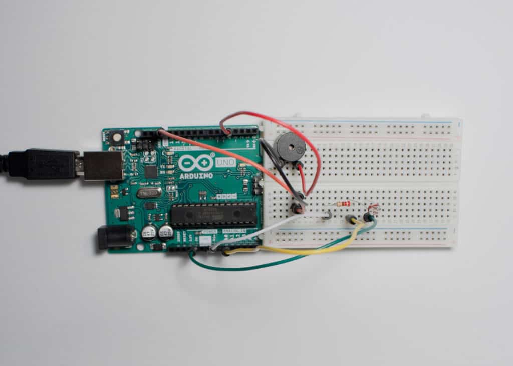 The Arduino controls the frequency of the buzzer. By using the voltage value the Arduino reads in, the Arduino changes the tone of the buzzer so that the tone you hear is directly dependent on the light that the photoresistor sees.