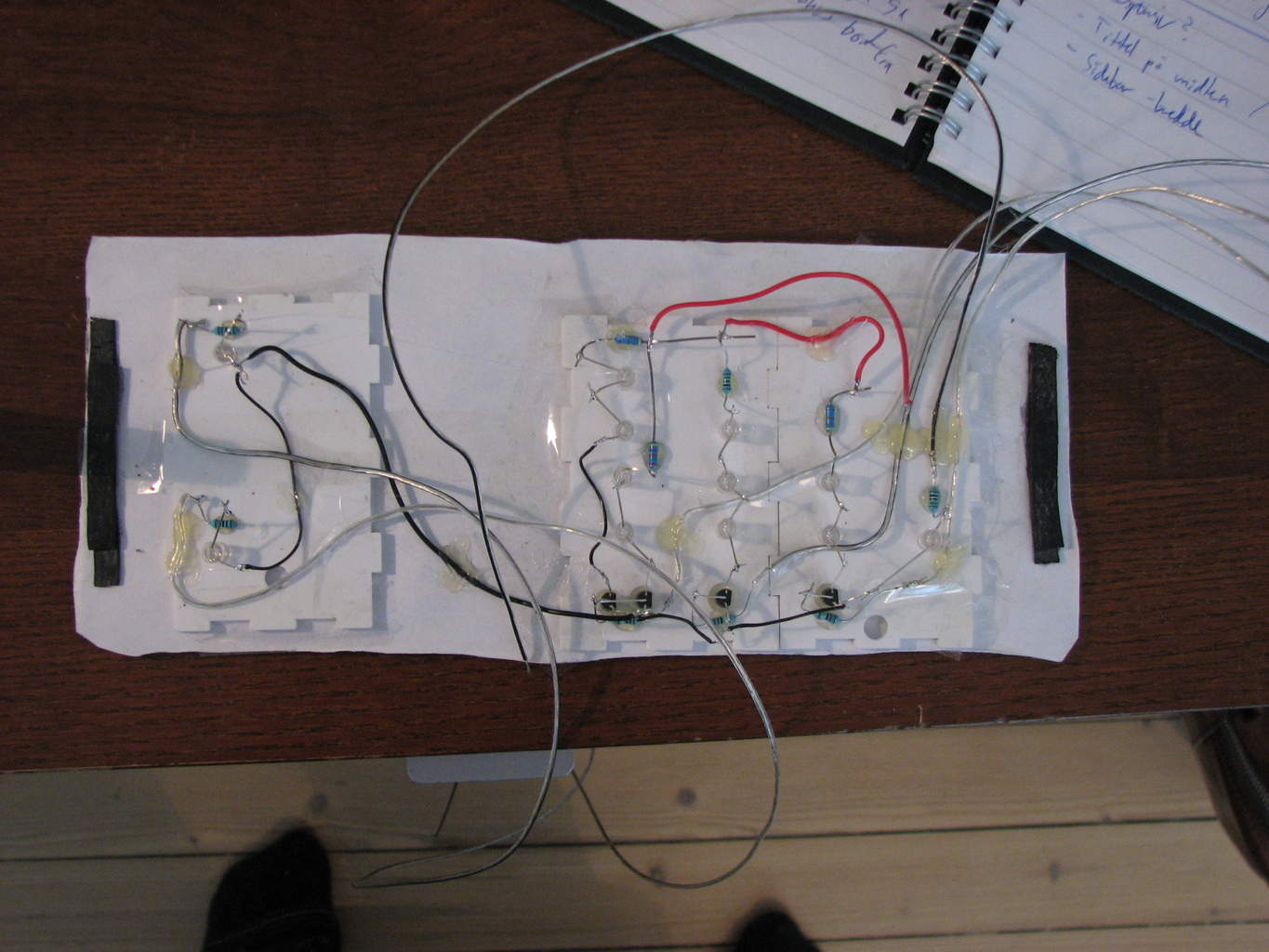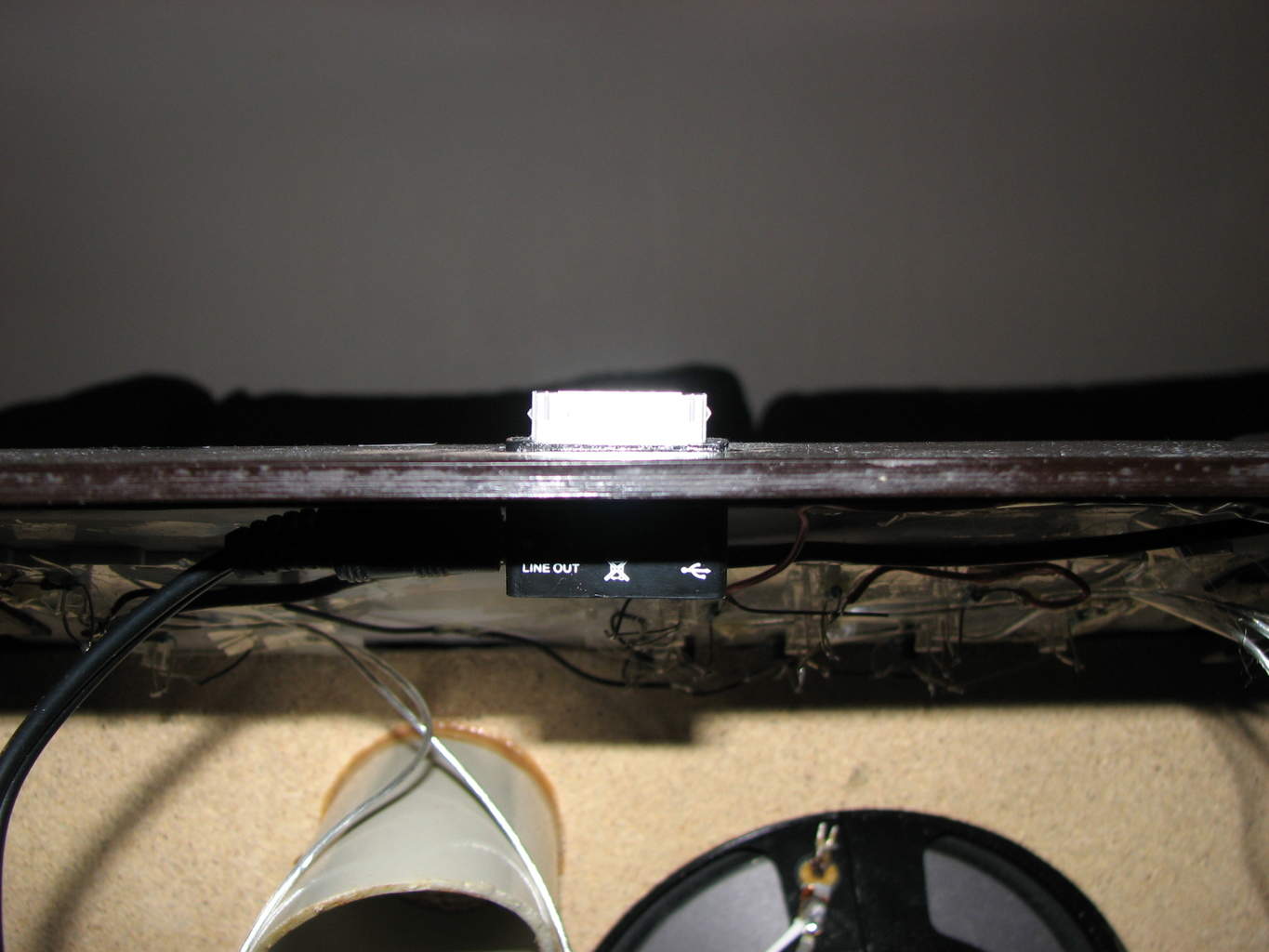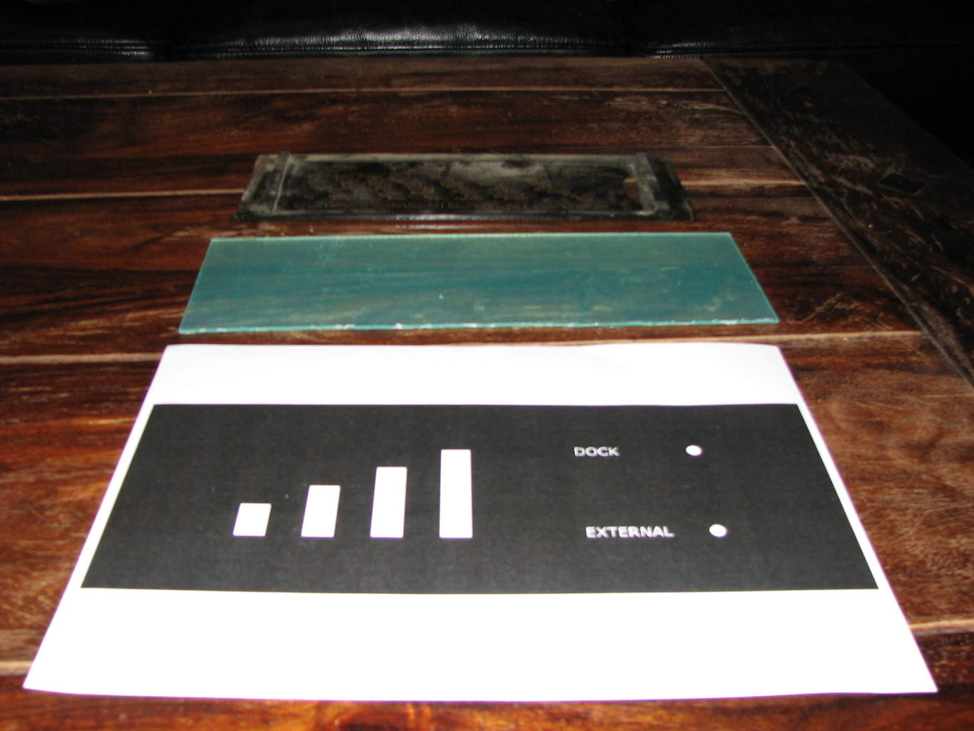 I made the display by drawing it on my computer, then printing it out on a sheet of paper placed behind a plastic window. I used LEDs on the back to indicate volume and source selection. The LEDs are controlled by an Arduino.