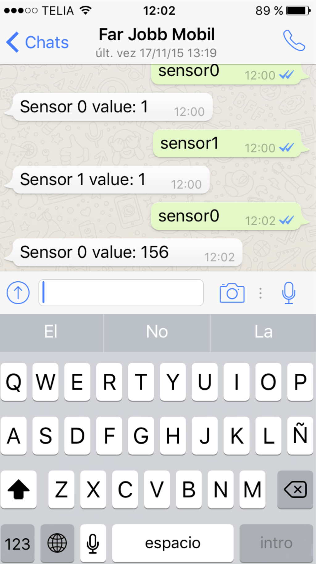With the Whatsapp application running, I can send either the message “sensor0” or “sensor1” to read the sensor values from either analog port 0 or analog port 1.