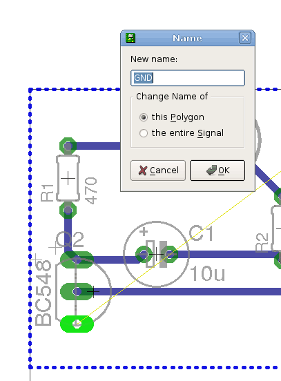 Draw a polygon over the entire board by left-clicking around the board.Use the “Name” tool to change the name of the polygon to “GND” (or whatever your ground signal is called).