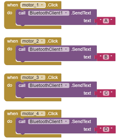 Then we created a simple mobile app with four buttons using MIT App Inventor. The app connects to the Bluetooth module and sends a letter to it, depending on which button was clicked: