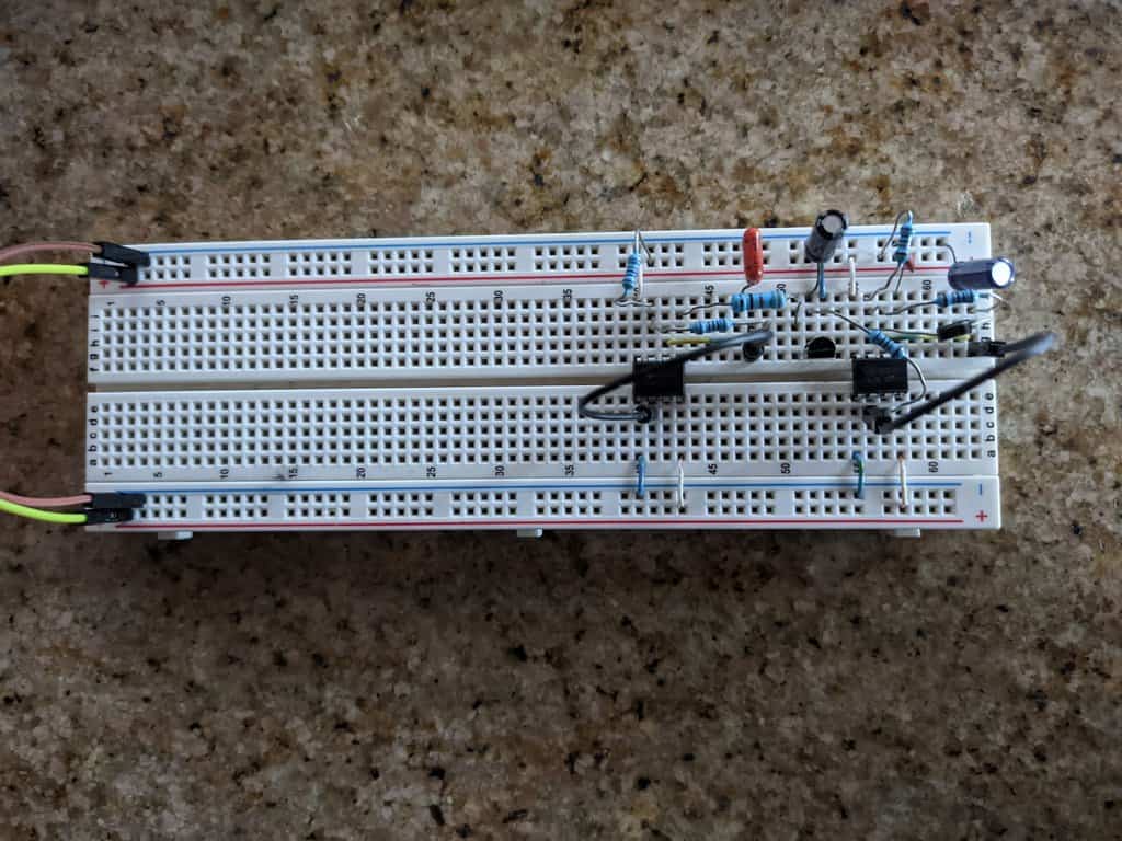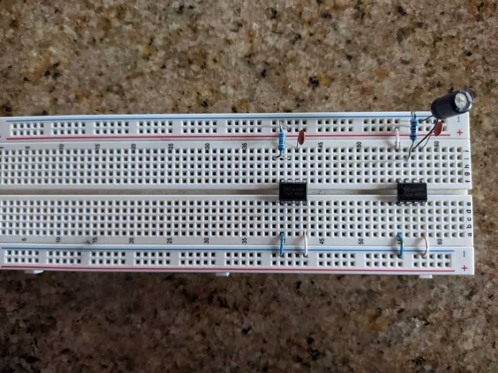 Then add the rest of the components and wires that make up the IC circuits. You can see that I used a small jumper (the yellow with blue cable) to take pin 6 to another row so that the components are placed more comfortably.