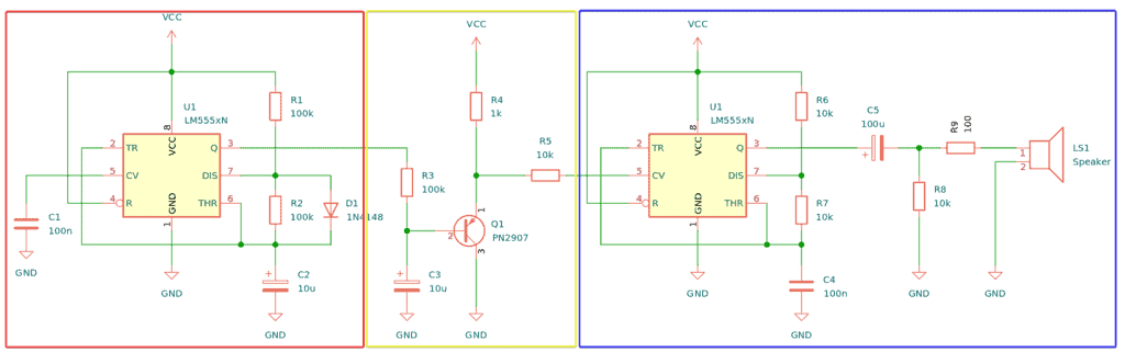 - Red square: Slow 555 circuit in astable mode