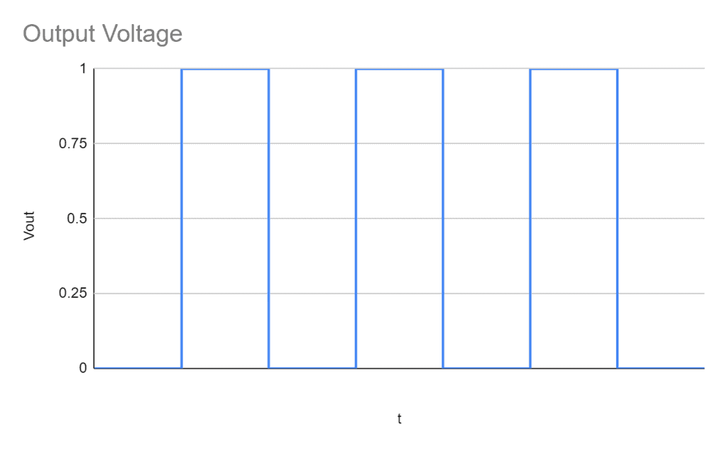 As you can see in the schematic, the circuit has three different parts for it to work. First, we have the astable multivibrator, which outputs an oscillating signal similar to this: