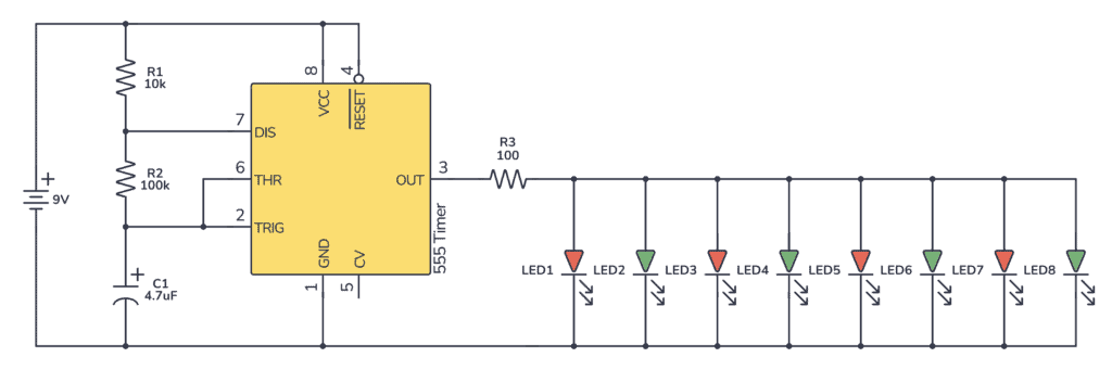 If you’re thinking about adding more LEDs, keep in mind that the 555 timer only supports around 200 mA of current. For example 20 LEDs with 10 mA.