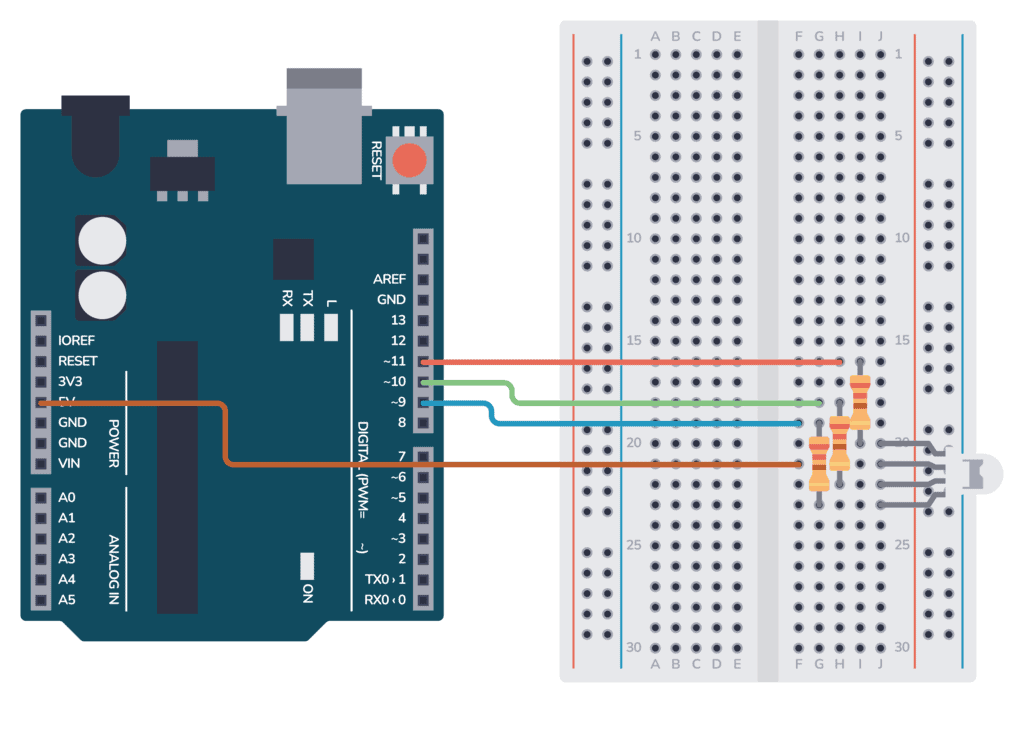 - Connect the red, green, and blue legs of the LED to pins 11, 10, and 9 of the Arduino respectively, each through a 220-ohm resistor.