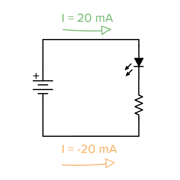 Just know that in the world of electronics, an electric current of -20 mA flowing from minus to plus is the exact same thing as a current of +20 mA flowing from plus to minus.
