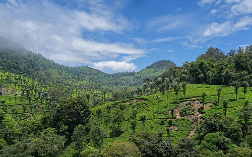 Glendale tea estate with silver oak shade trees, verdant green and bright blue during a break from the monsoon rains. View from NH-181, Kattery, Nilgiris district, Tamil Nadu, India